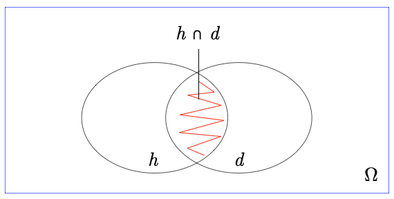 The intersection of h and d represents all the outcomes where the biased coin was flipped and the sequence contains exactly two HEADS. We can write this probability as {P(h \cap d)}, or equivalently, P(h, d).