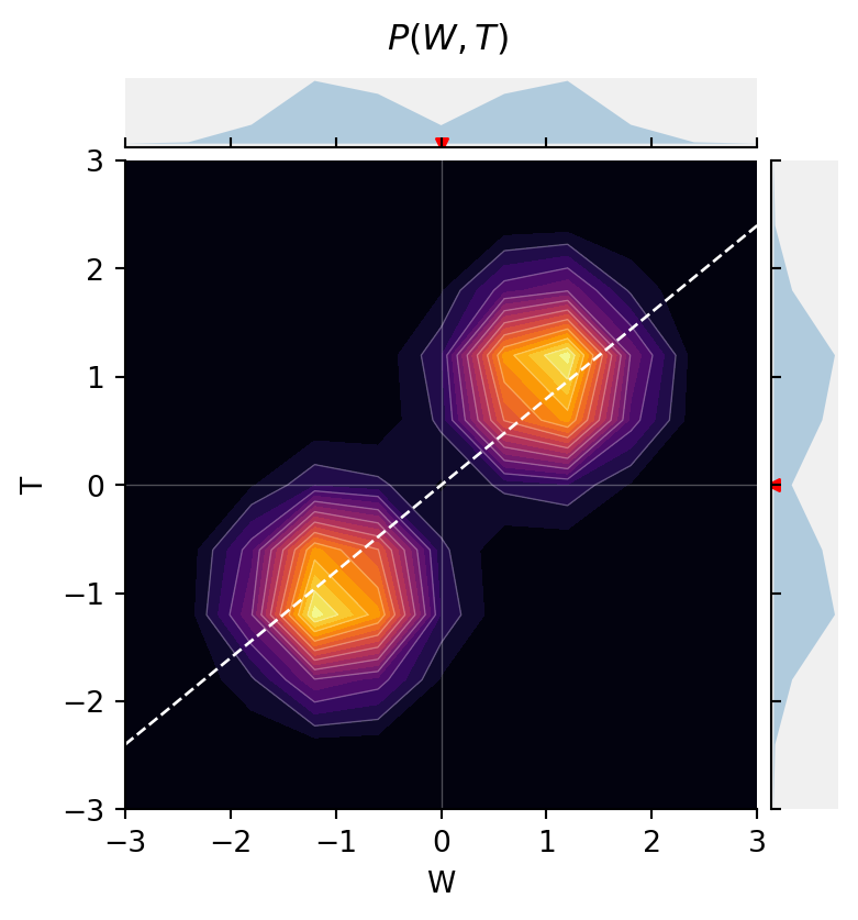 In the joint model, { P(A, B) \neq P(A) \; P(B) }.