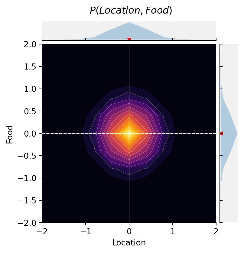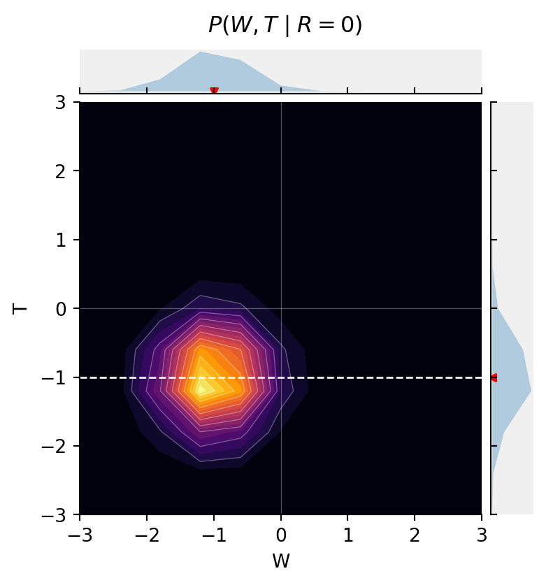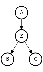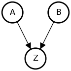Note: The DAG above shows the model {P(A, B, Z)}. However, the @memo (fork) is conditioned on B — this done purely because it’s easier to visually inspect if { P(A \mid B) = P(A \mid \neg B) = P(A) } than it is to inspect if { P(A, B) = P(A) \; P(B) }.