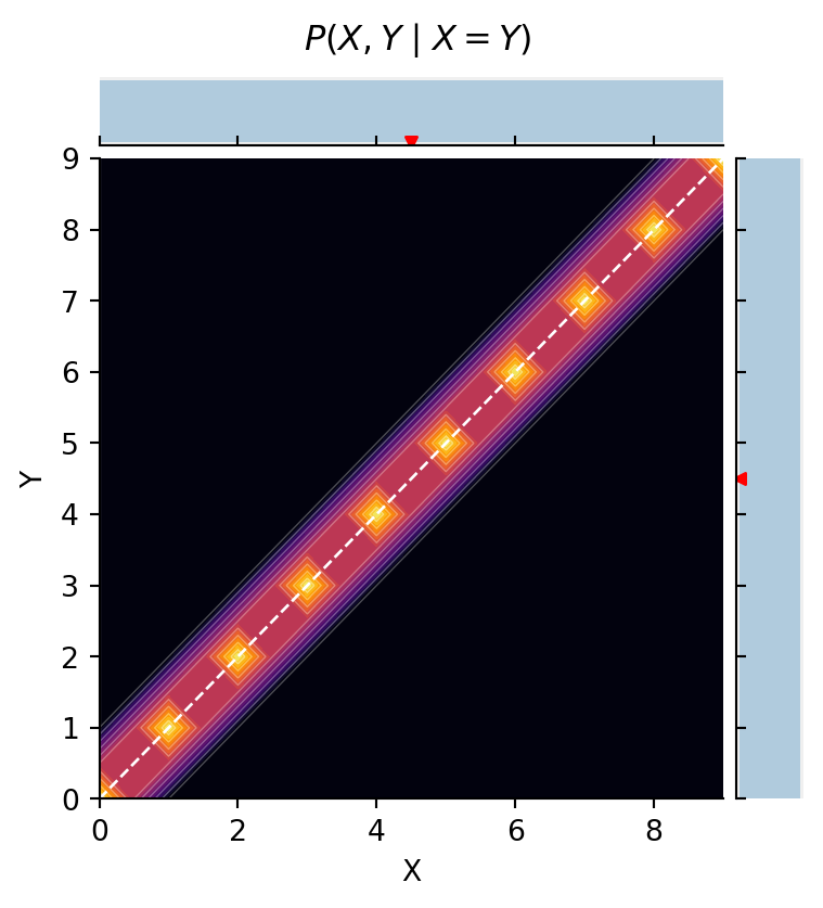 For instance, let’s look at a common cause example (a “fork”). Here, A and B are associated ({A \not\perp B}). We can determine this by observing that { P(A \mid B{=}\mathtt{true}) \neq P(A \mid B{=}\mathtt{false}) }.
