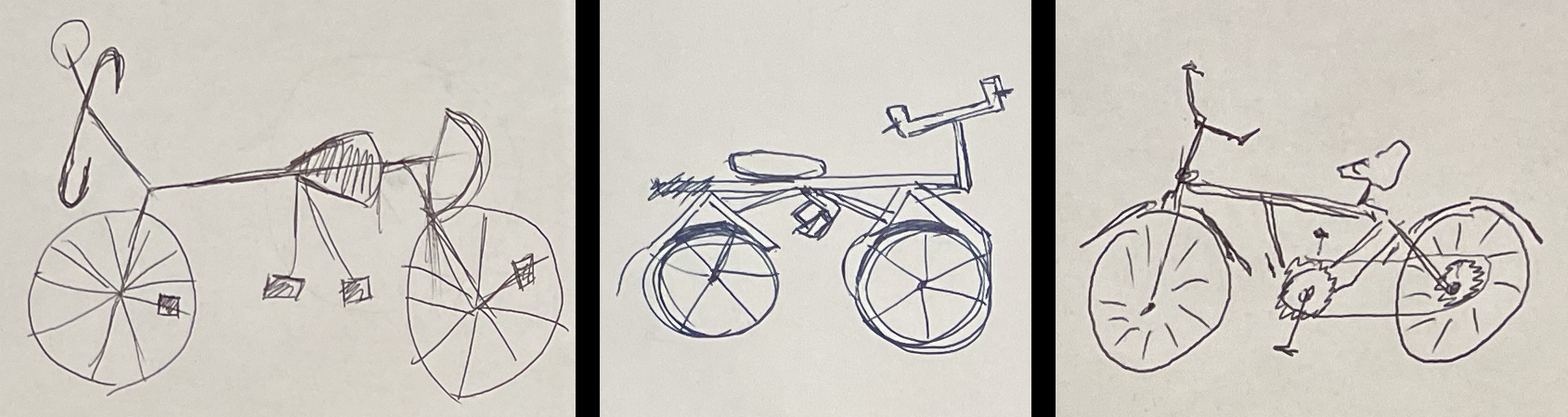 Most of us have a lot of behaviorally relevant interactions with bikes and bike parts. Even people who have ridden bicycles for hundreds of hours, changed tires, greased changes, etc. might draw bicycles that are comically unridable. This becomes all the more apparent when people’s drawing are rendered in 3d: